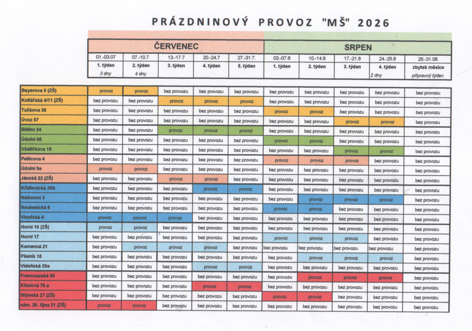 První školní den začíná v pondělí 1. 9. 2025, školka je otevřená od 6:30, těšíme se na Vás. :-)